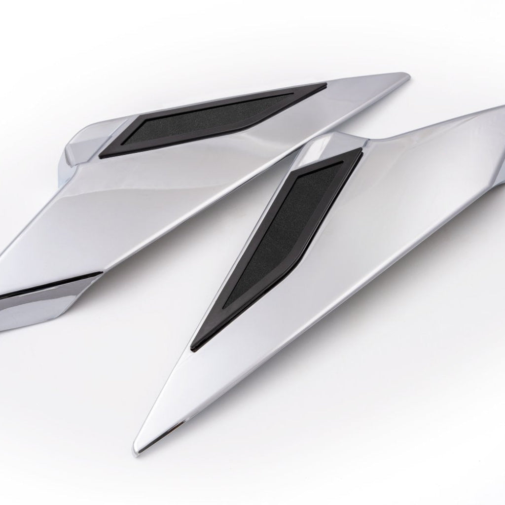 The Twinart Side Covers enhance the original dull black plastic side covers with brilliant chrome to help dress up your Gold Wing. These covers fall perfectly into place, just like OEM, and feature a sleek rub guard to avoid scuffs. The Twinart Side Covers look great shining solo, and are also compatible with the Goldstrike Frame Covers to really make an impact!